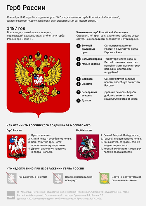 Герб России, наряду с флагом и гимном, – это официальный государственный символ Он представляет собой красный геральдический щит с золотым двуглавым орлом, который держит в лапах скипетр и державу. На груди орла изображён всадник, поражающий копьём чёрного дракона.