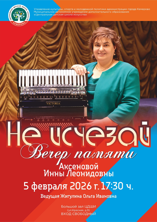 5 февраля 2026 года в Центральной детской школе искусств (г. Кемерово) состоялся концерт, посвящённый памяти Аксёновой Инны Леонидовны.
