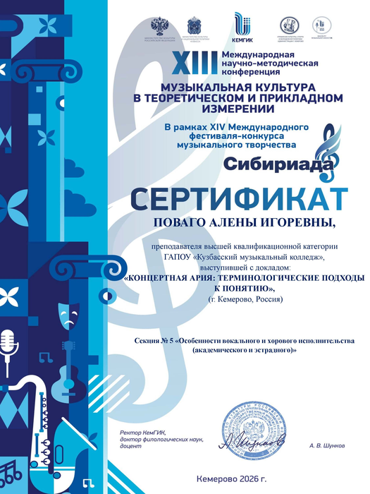 преподаватель специальности «Вокальное искусство» Кузбасского музыкального колледжа Поваго Алёна Игоревна (доклад «Концертная ария: терминологические подходы к понятию»).