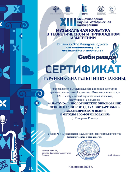 председатель цикловой комиссии «Вокальное искусство» Кузбасского музыкального колледжа Тараненко Наталья Николаевна (доклад «Анатомо-физиологическое обоснование феномена “низкого дыхания” (appoggio) в академическом пении и методы его формирования);