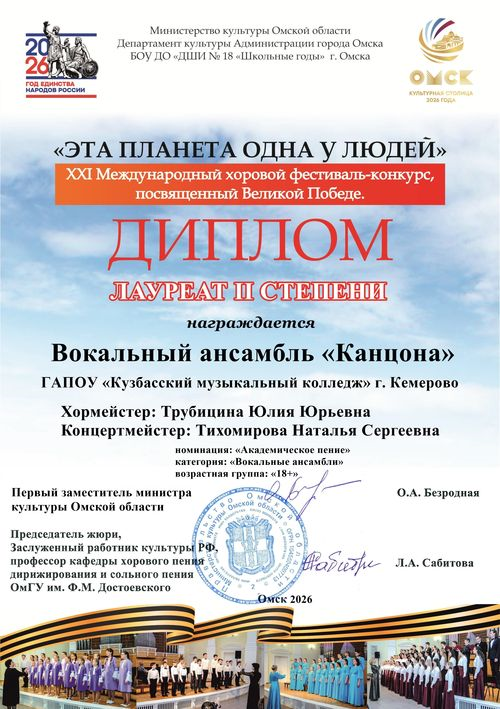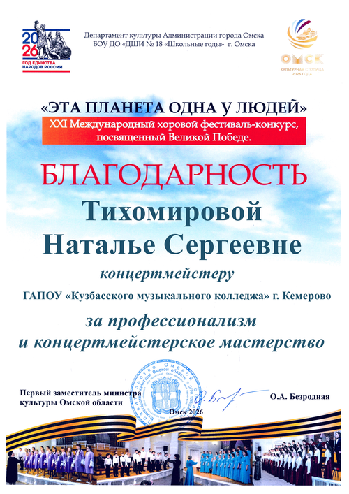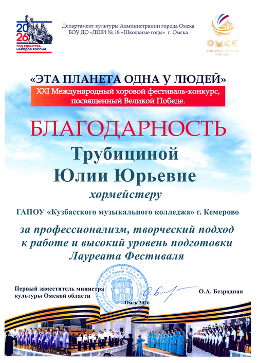 В апреле 2026 года при поддержке Департамента культуры Администрации города Омска состоялся XXI Международный хоровой фестиваль-конкурс «Эта планета одна у людей», посвящённый Великой Победе.