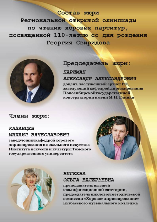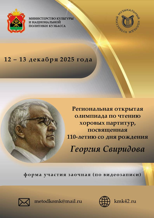 12-13 декабря 2025 года Кузбасский музыкальный колледж будет проводить Региональную открытую олимпиаду по чтению хоровых партитур, посвящённую 110-летию со дня рождения Георгия Свиридова.