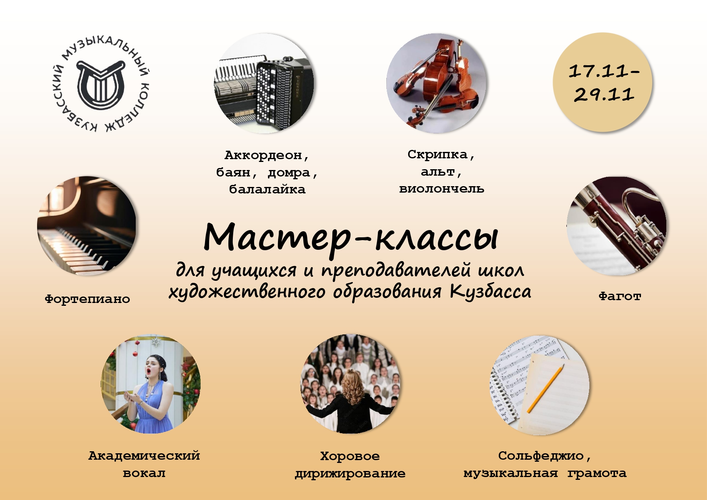 С 17 по 29 ноября 2025 года преподаватели Кузбасского музыкального колледжа будут проводить мастер-классы для учащихся и преподавателей детских музыкальных школ и школ искусств Кемеровской области – Кузбасса по специнструментам и музыкальным дисциплинам: фортепиано, баян, аккордеон, домра, балалайка, скрипка, альт, виолончель, фагот, академический вокал, хоровое дирижирование, сольфеджио, музыкальная грамота.