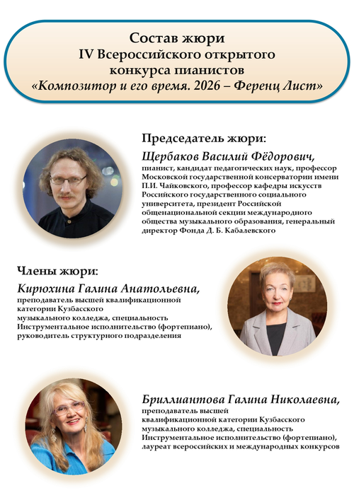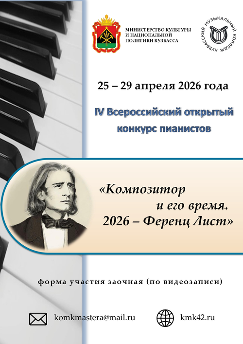 Кузбасский музыкальный колледж приглашает принять участие в IV Всероссийском открытом конкурсе пианистов «Композитор и его время. 2026 – Ференц Лист», который состоится с 25 по 29 апреля 2026 года в заочной форме (по видеозаписям).