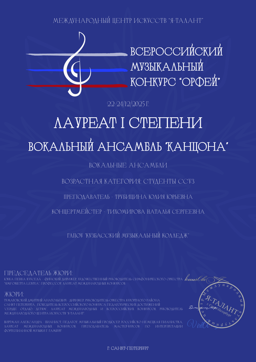 По итогам конкурса вокальный ансамбль «Канцона» (руководитель Трубицина Юлия Юрьевна, концертмейстер Тихомирова Наталья Сергеевна) стал лауреатом I степени.