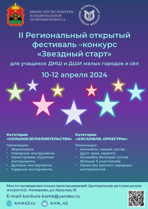 10–12 апреля 2024 года прошёл II Региональный открытый фестиваль-конкурс «Звёздный старт» для учащихся ДМШ и ДШИ малых городов и сёл. Учредитель конкурса – Министерство культуры и национальной политики Кузбасса.